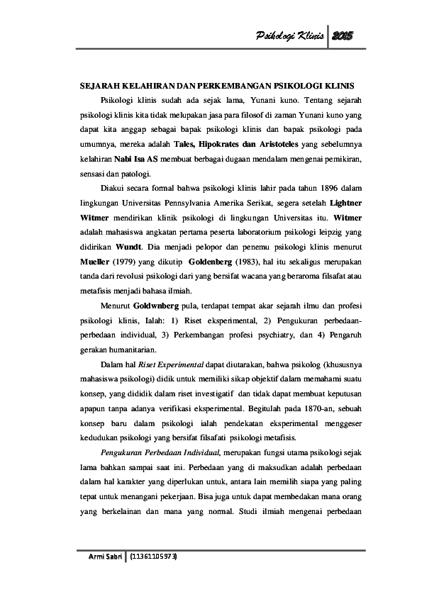 Pdf Sejarah Kelahiran Dan Perkembangan Psikologi Klinis Eni Yulianti Academia Edu